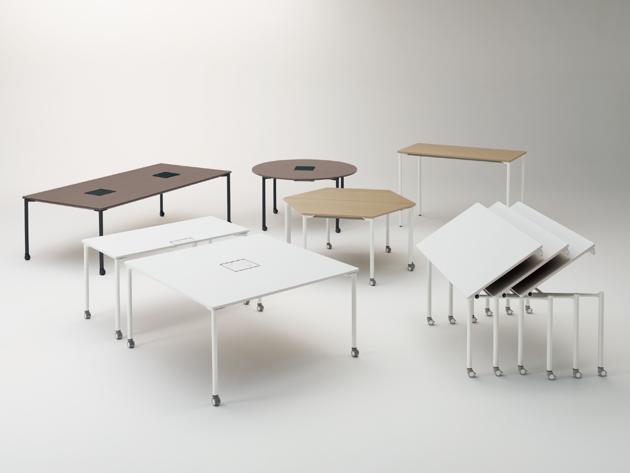 脚頂部にラッチを差し込むカタチの機構部分の造形が単純で美しく、直感的な操作ができる点を評価したい。また、フラップテーブルでありながら、方向性(座る向き)を感じさせず、前後から使うことができ、個別のワークからグループワーク、ミーティングへのシーンを連続的に提供できる可変性を感じた。