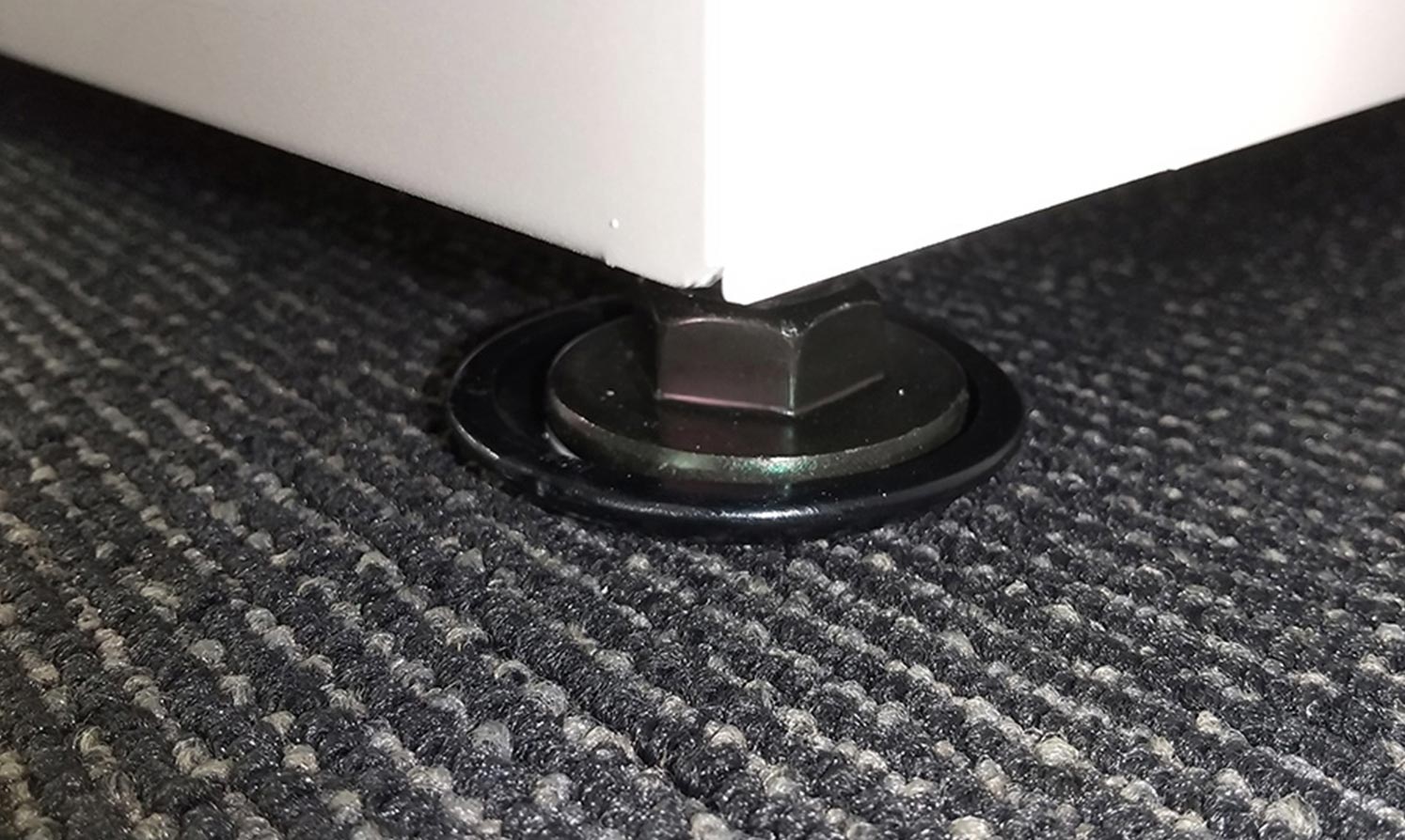 田中(開発):耐震性が高いことです!地震が起こると“ロッキング”と呼ばれる左右に大きく振れる揺れ方をしてしまい、ブース内に大きなダメージを与えます。そこで、床に設置するアジャスターに滑り性能のあるカバーを取り付け、 “滑らせる”ことで揺れのダメージを軽減させる耐震技術を組み込みました。