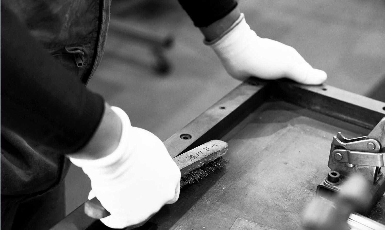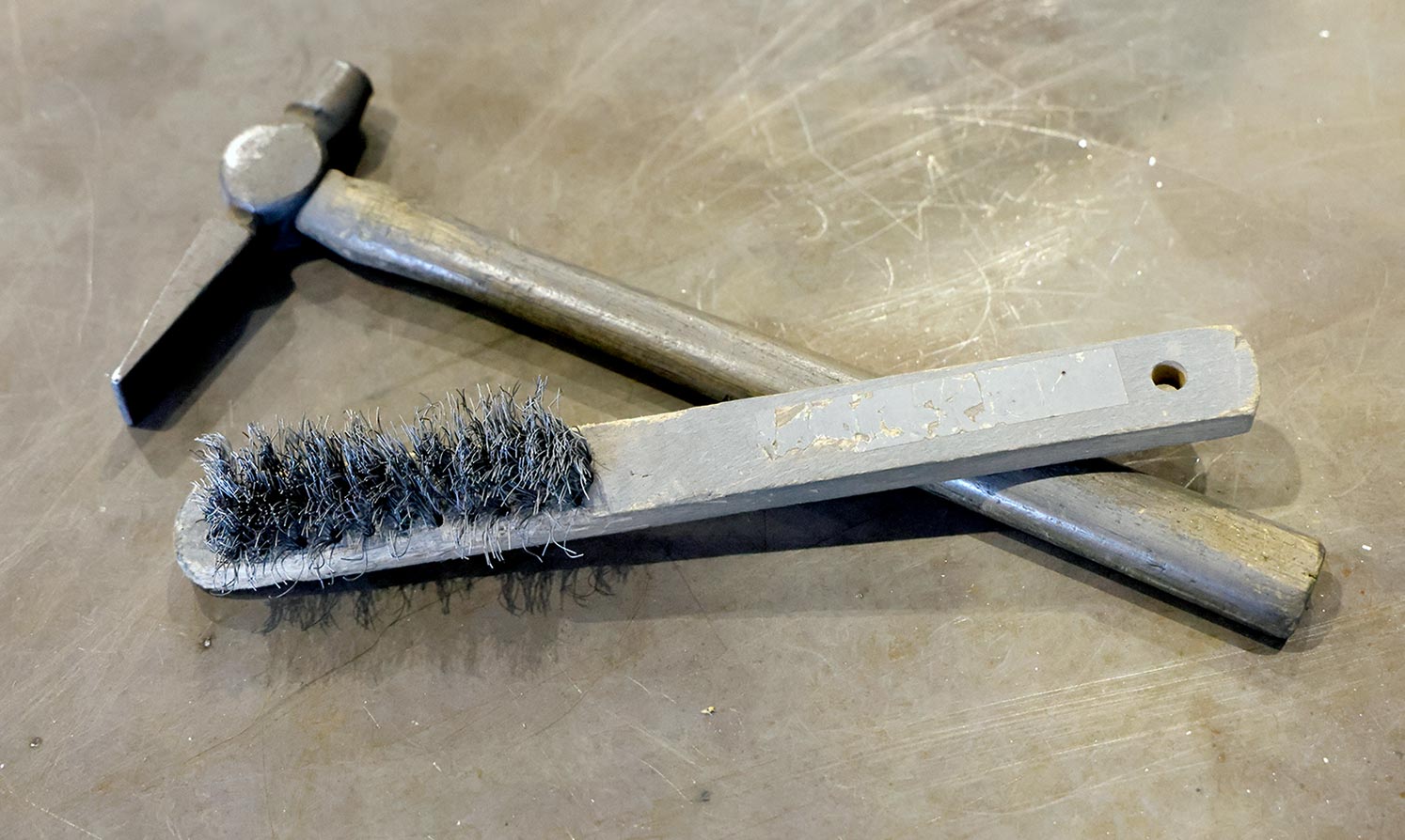 TIG溶接前に台の上をきれいにする金たわし、フレームの位置を調節するチッピングハンマーは溶接に携わってからずっと同じものを使い続けています。週1回は欠かさず手入れしているといい、中山さんは「僕にとってのパートナー」と大事そうに見つめます。