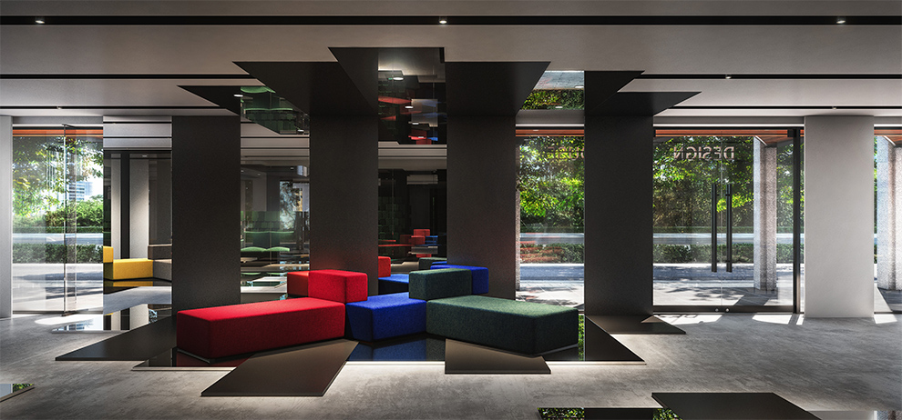 会場には、壁面から天井、床に伸びた黒のラインを起点に広がるストライプと、ところどころに配されたミラー(鏡)によって、従来の視覚的な枠組みを超え、展示空間に新たな解釈や意味を生み出し、来場者の思考を促します。また、そのミラーによる空間の広がりは、オフィスファニチャーに必要な拡張性を表現しています。