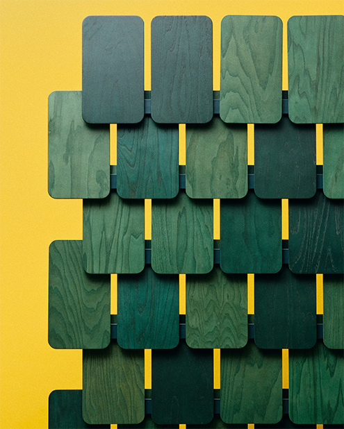 隙間が光や風を通し、視線をほどよく遮る鱗状のパネルが特徴的な、ディバイダーとソファの2つのスタイルを備えた家具です。周囲が見渡せる高さのロータイプとちょうどいいこもり感のミドルタイプ、空間をゆるやかに仕切るハイタイプ(ディバイダーのみ)の