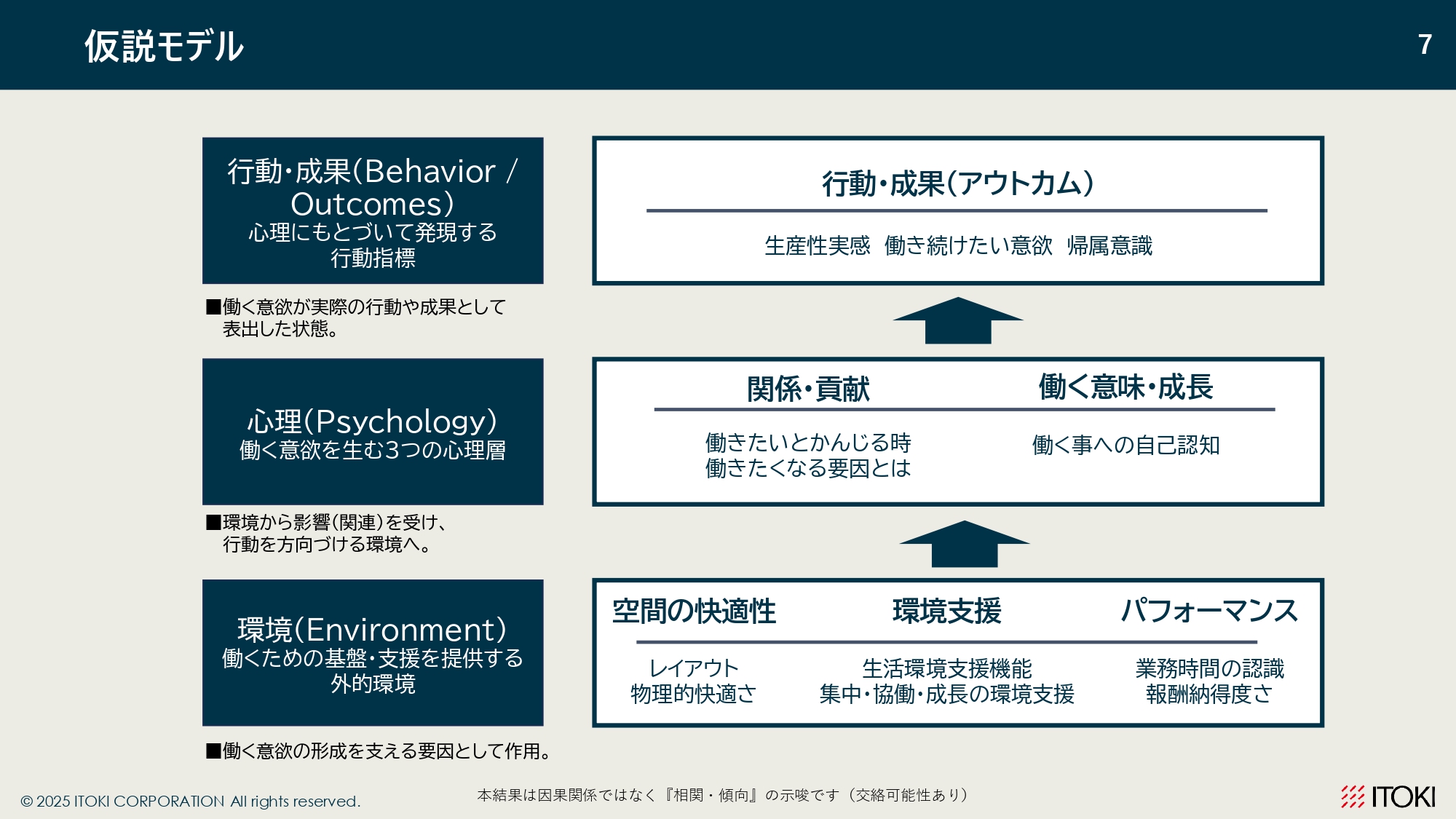 本調査では、オフィスをめぐる要素を「環境(集中・協働・成長・業務効率の支援)」「心理(意義・信頼・自律)」「行動・成果(生産性・継続意欲・帰属意識)」の3層で整理し、相互の関係性を分析しました。