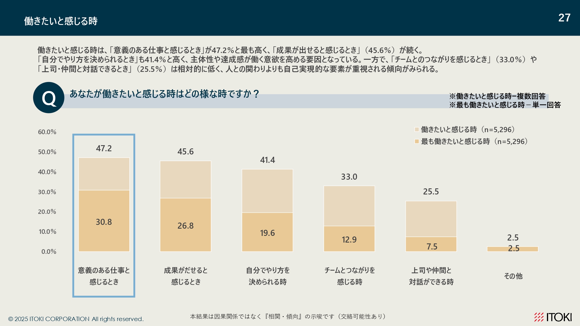 “働きたいと感じる時”を年代別に比較したところ、全体としては「意義のある仕事に取り組めている時」「成果が出せる時」「自律的に働ける時」が主要な要因として挙がりました。一方で、“最も働きたいと感じる時”は、年代に応じて重視ポイントが明確に分かれる結果となりました。
