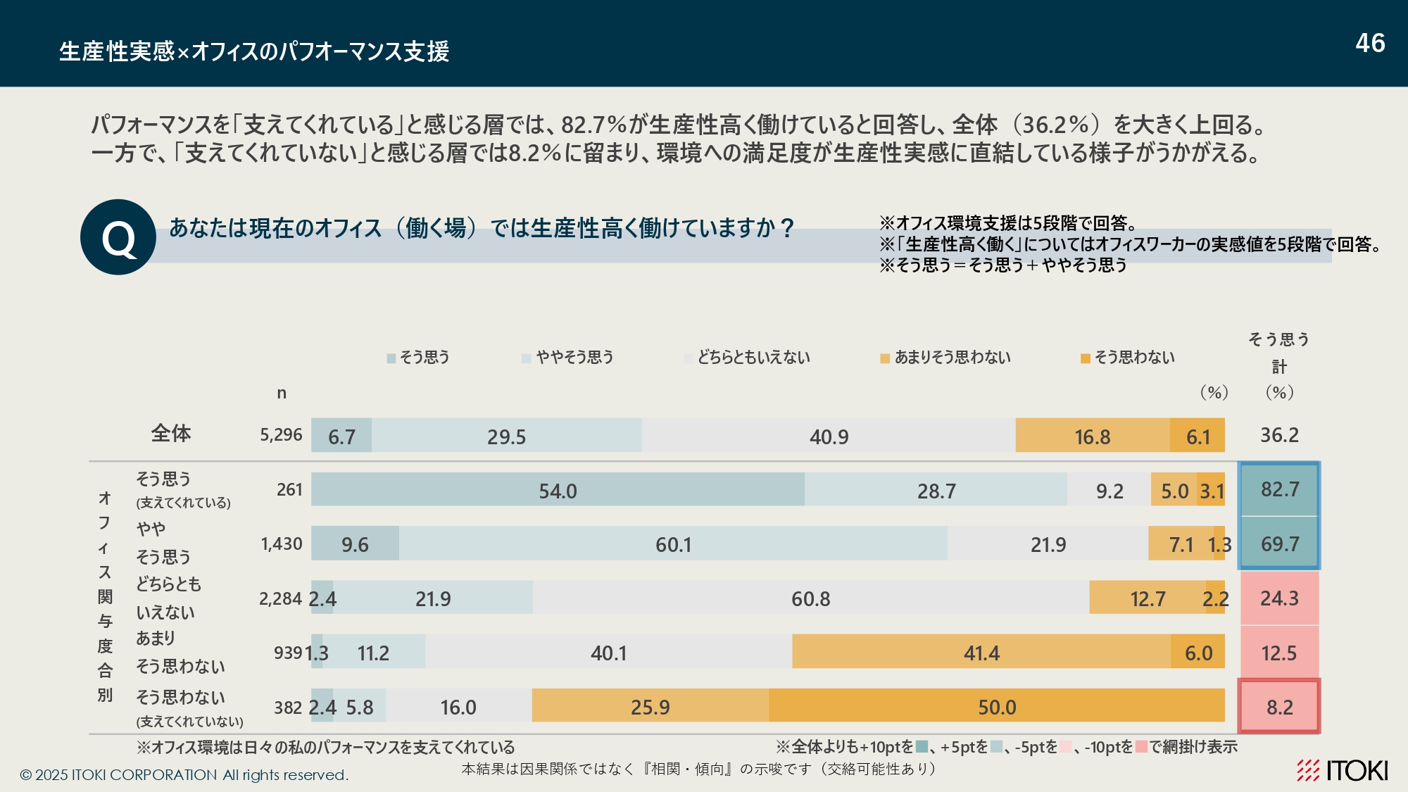集計の結果、支援を体感できるオフィス環境ほど、仕事の意義や上司・同僚への信頼、自律性といった心理指標が高まり、その先に生産性実感や働き続けたい意向、会社への帰属意識の高さが連なっていく構図が確認されました。因果関係を断定するものではありませんが、「環境を整えること」と「心理体験を豊かにすること」が、結果として行動や成果につながる連鎖構造として示唆されており、オフィスづくりと人材マネジメントを一体で考える必要性がうかがえます。