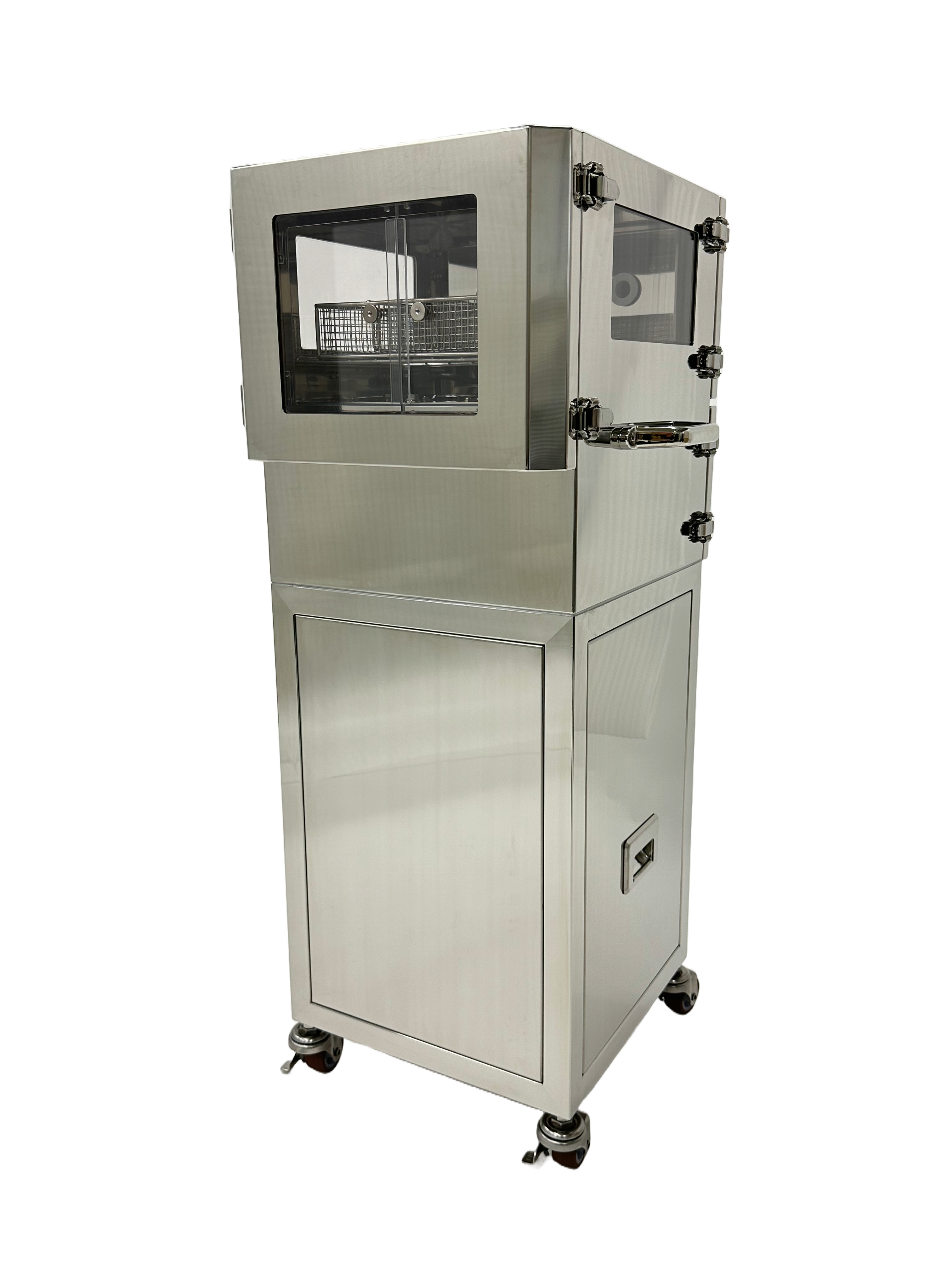 再生医療の研究・製造現場における無菌操作で必要な物品除染に特化した移動式の除染ボックスです。ボックス内の専用ラックに注射針や滅菌チューブ等の使用物品を入れて除染した後、装置をクリーンベンチや安全キャビネット等の前に置き、装置から物品が入ったラックをスライドさせてクリーンベンチ等に搬入します。これにより、高い清浄度環境を維持した物品搬送を可能とし、拭き取り作業や偽陽性対応にかかる工数を大きく削減します。