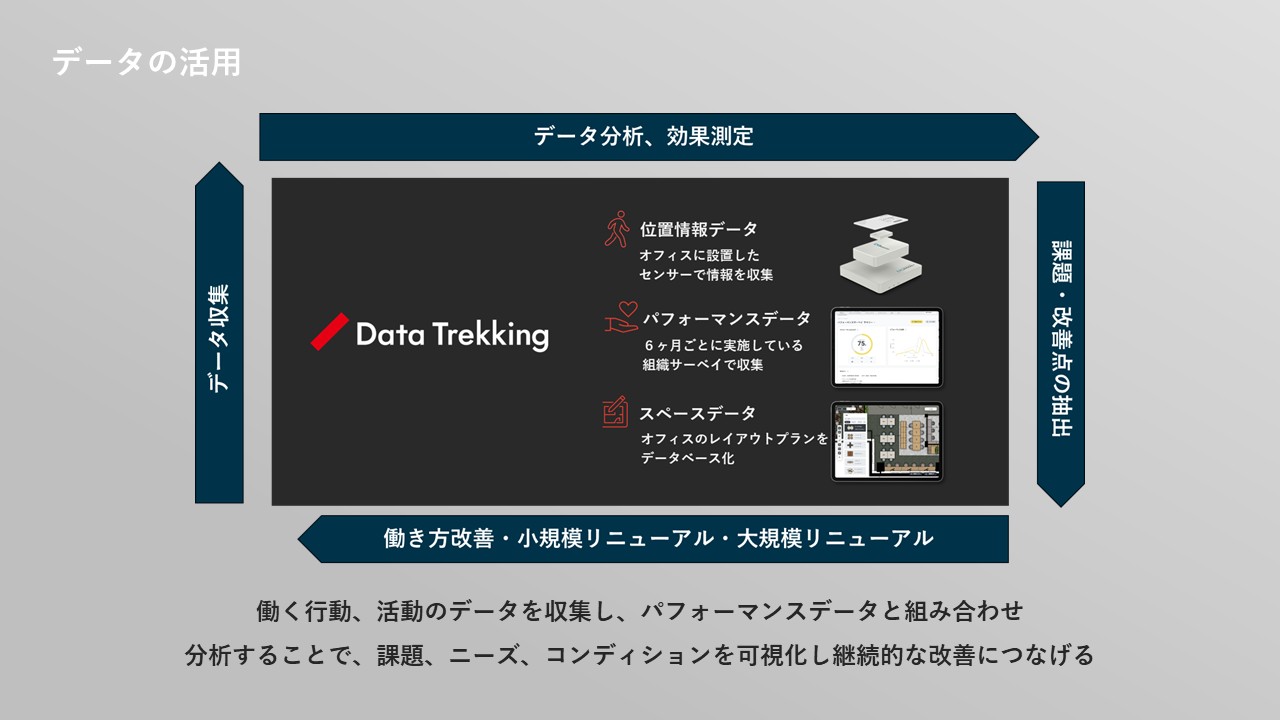ITOKI DESIGN HOUSE SHIGAでは、空間を一度整えて終えるのではなく、使われ方をデータで捉え、改善を重ねていく仕組みとして「Data Trekking」を導入しています。人の動きや空間の利用状況を可視化する位置情報データ、働きやすさやエンゲージメントを把握するサーベイデータ、レイアウトや用途を管理するスペースデータを組み合わせて分析。これまでの知見にデータを掛け合わせ、より確かな根拠に基づく改善サイクルを実現しています。