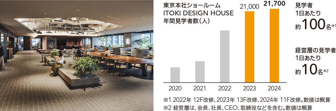 商品・サービスを体感いただくため、お客さまにオフィスや工場を見学いただいています。東京本社ショールーム「ITOKI DESIGN HOUSE」の見学者数は2024年も2年連続で2万人を超えました。ショールームだけではなく、工場見学者も年々増加。お客さまやお取引先さまとの対話を通じた気づきを製品・サービス改善に役立て、より良い価値提供に努めています。