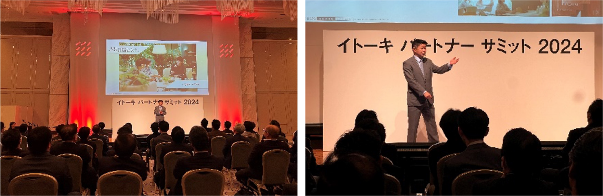 お客さまに価値を届けるための最重要パートナーである販売代理店のみなさまと、さまざまな機会を設けて交流を促進。パートナーシップを強固なものとするため、毎年、全国の代理店社長を招いての会議を開催しています。2024年は「オルガテック東京2024」出展にあわせお集まりいただき、イトーキの未来への働き方への提言を体感いただく場となりました。