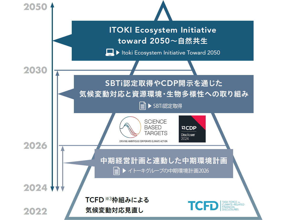 イトーキグループは、気候変動や資源循環に関するイニシアティブに積極的に参加しています。TCFD提言への賛同表明、CDPへの回答、SBTiの認定取得、取得気候変動イニシアティブ(JCI)への賛同など、これらイニシアティブへの参画を通じて、気候変動対策を推進するとともに、より一層の情報開示の充足に努めます。