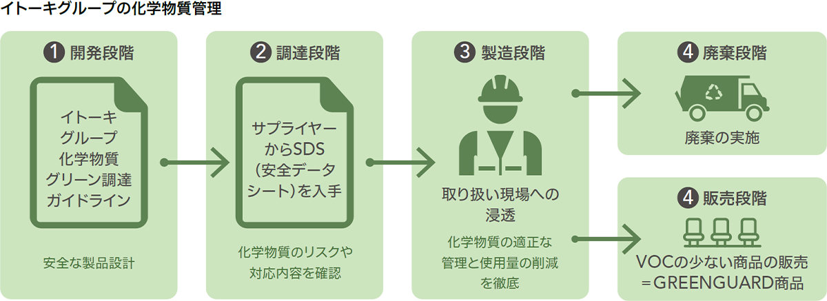 従来は日本国内法に準拠した化学物質管理を行っていましたが、製品の海外展開を踏まえ、国外規制を考慮した「イトーキおよびイトーキグループ製品含有化学物質管理ガイドライン」を定め、製品ライフサイクルを通じた包括的な管理を行っています。