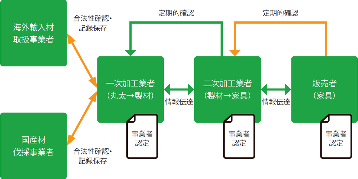 イトーキはサプライチェーンにおいて、家具の「販売者」および製材から家具を製造する「二次加工業者」にあたり、合法木材を取り扱う証明として事業者認定を取得しています。この認定取得のため、イトーキのサプライヤーである一次・二次加工業者に対しては、合法性調査にて事業者認定取得の有無を確認し、未取得の場合は現地調査にて合法性を確認しています。製材を行う一次加工業者が合法性を証明するためには木材取扱事業者による合法性記録が必要であり、これら一連のつながりでサプライチェーン全体のトレーサビリティを確保しています。