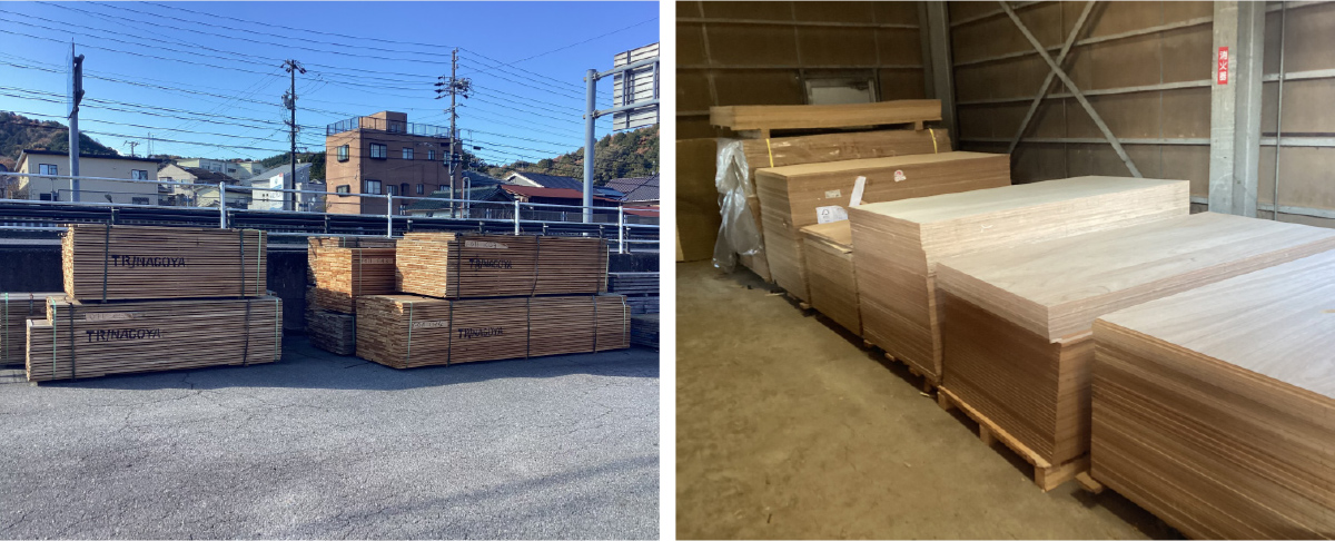 トレーサビリティ確保のため、種類の異なる木材を混ざらないように管理(左から野外での仮置き、室内保管)