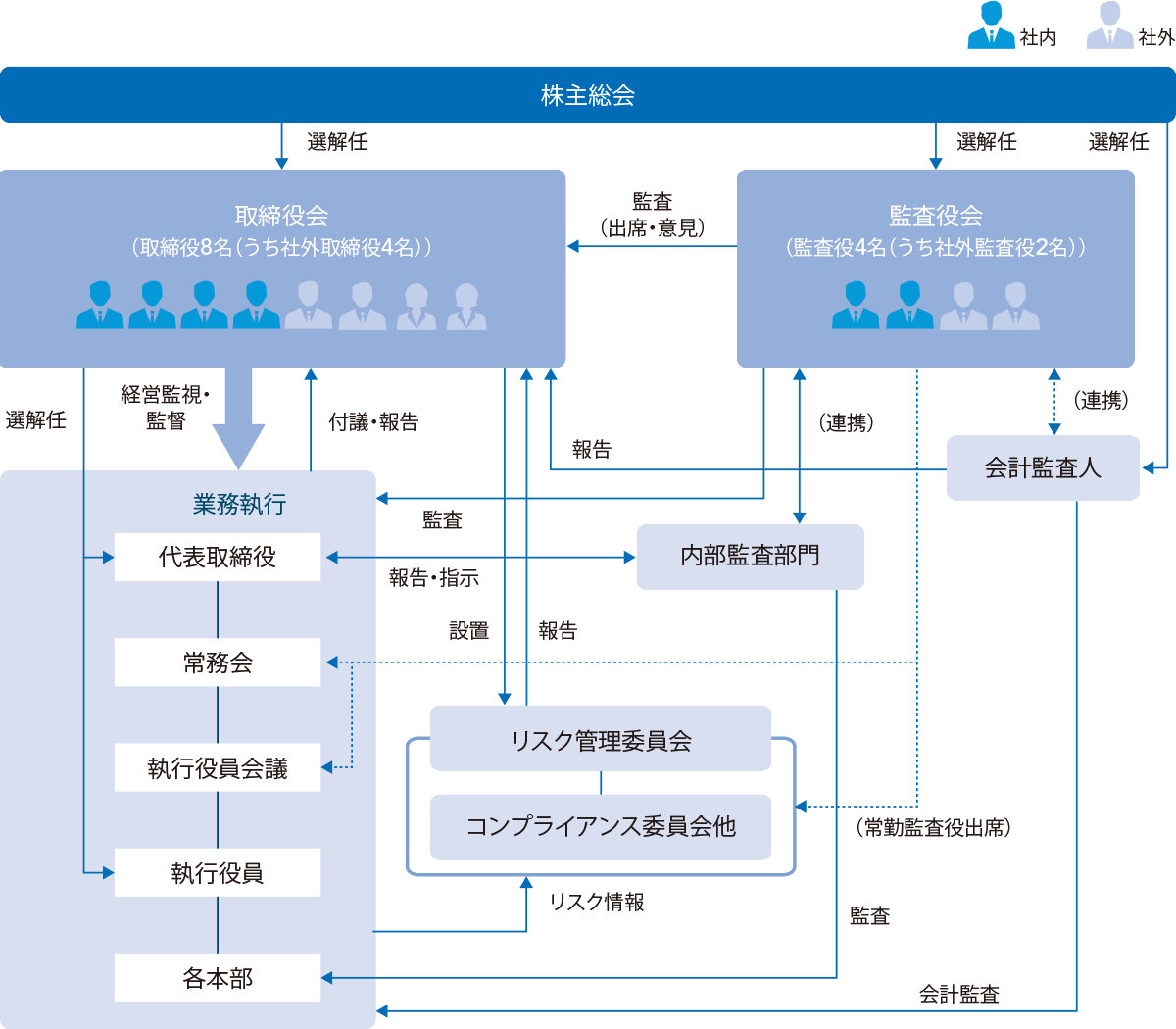イトーキは監査役制度を採用し、取締役会において経営の意思決定と業務執行の監督を行っています。取締役会を補完する機能として、常務会・執行役員会議を開催し、重要決裁事項の審議、経営方針の徹底、業務進捗状況の確認などを行っています。また、業務執行の機能強化・経営効率の向上を目的として、「執行役員制度」を導入しています。監査役は、取締役会などに出席し、取締役の業務執行状況を監査し、監査役会は、会計監査人および業務執行部門から独立した内部監査部門と連携し、総合的かつ効率的な監査の実施に努めています。内部監査部門は、計画的に監査を実施することで、グループ全体の内部監査の充実を図っています。