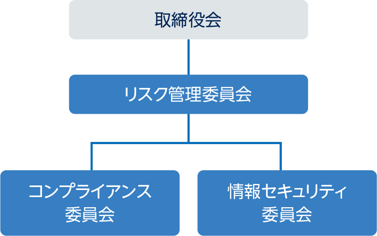 リスク管理委員会は、コンプライアンス委員会、情報セキュリティ委員会と連携をとり、リスク管理方針の策定とリスク評価、対策レベルの決定をし、主管部門に具体的な対策を指示します。