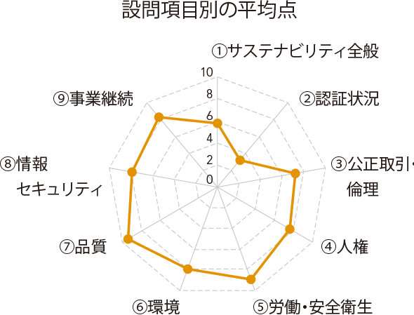 2024年の回答結果からは、「労働・安全衛生」「品質」「事業継続」において高い基準での取り組みが確認されました。「人権」「環境」はサプライヤー間で取り組み状況に差が見られましたが、イトーキではこれらを重要な項目と認識しており、今後取り組みが拡大されるよう促進していきます。回答全体から、高リスクと判定されるお取引先さまは確認されませんでした。