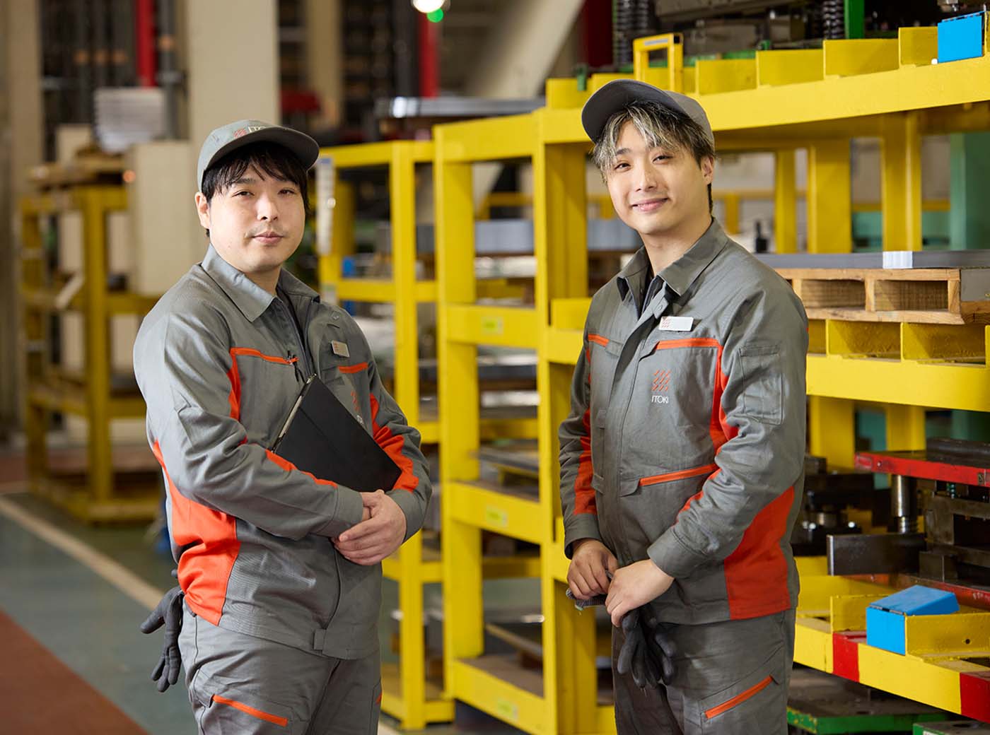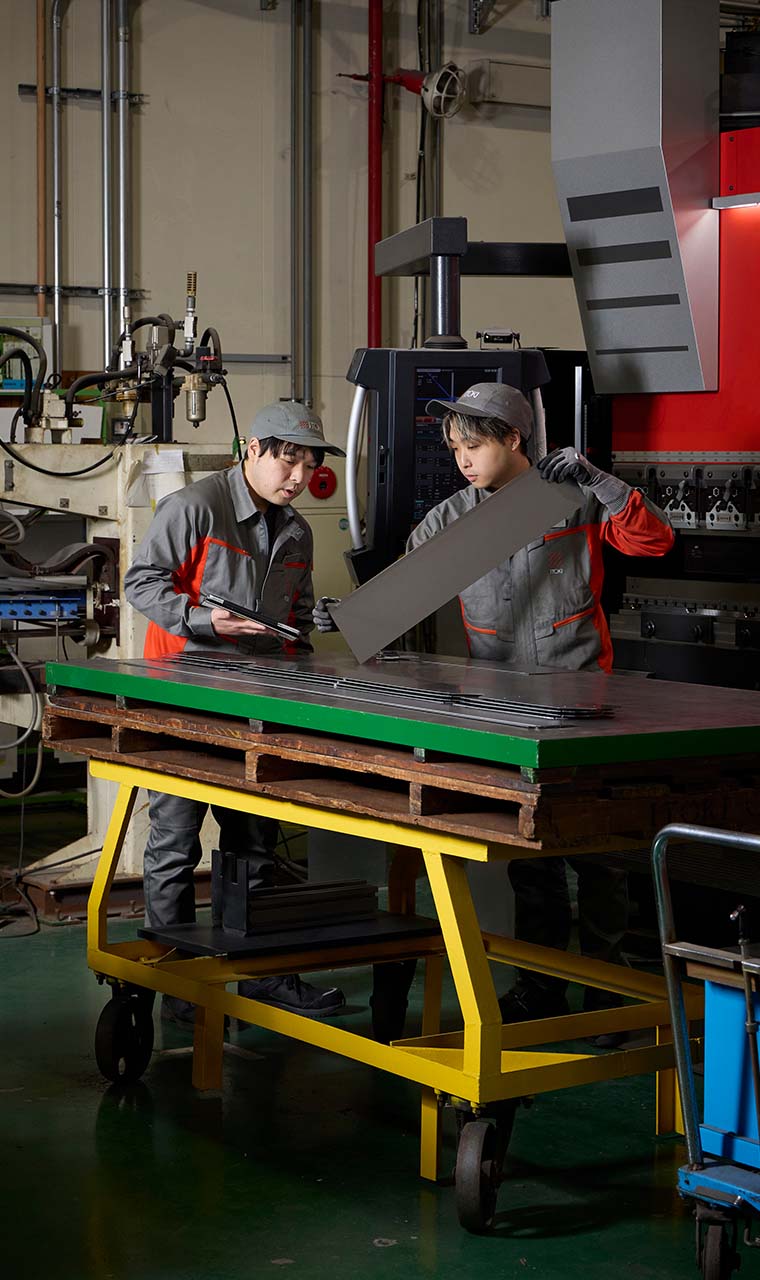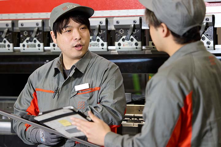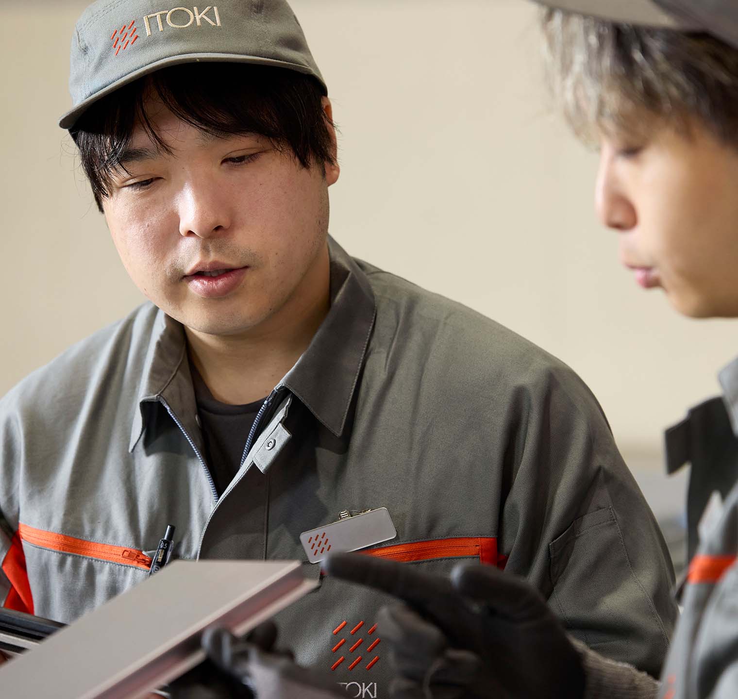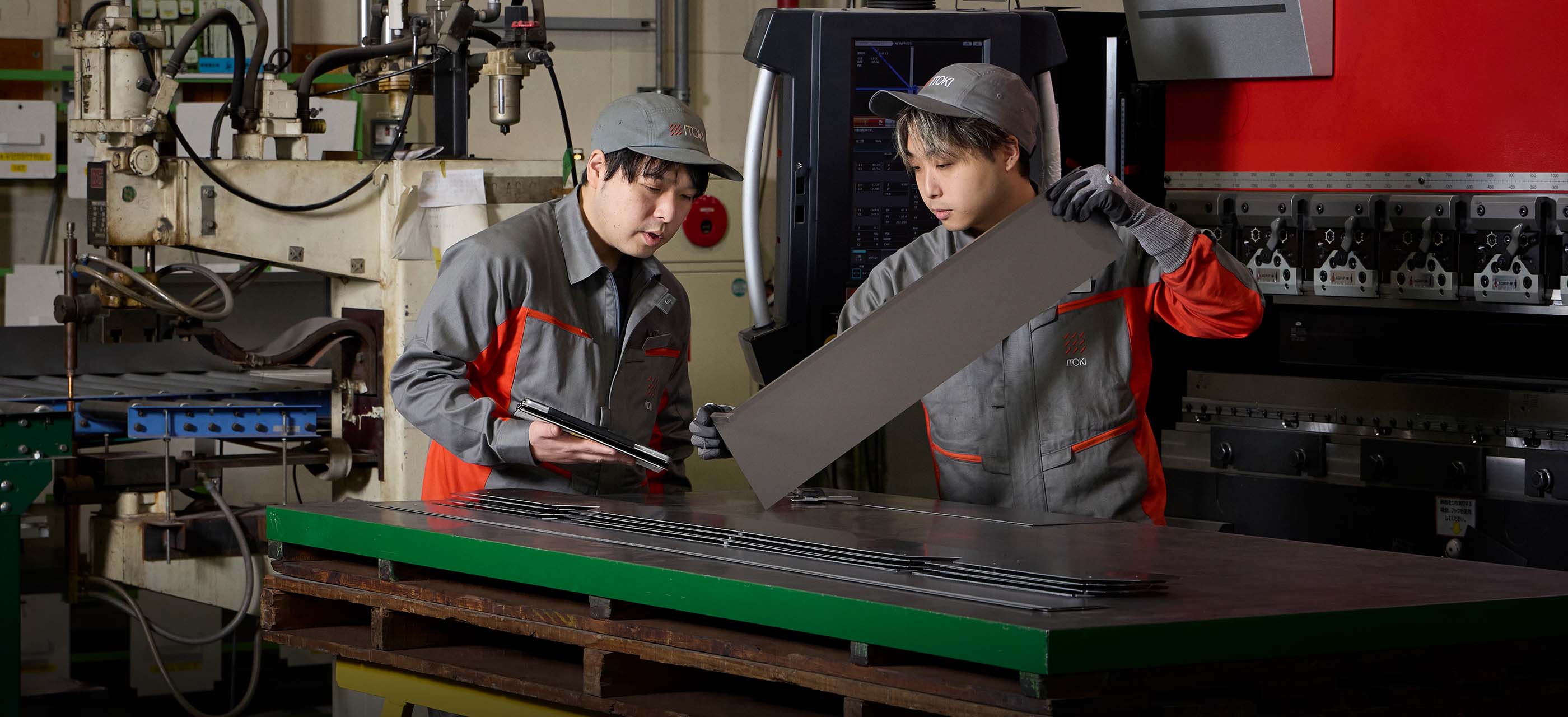 上司と部下であり、兄弟でもある二人が担当しているのは、キャビネットの一部となる部材のプレス加工。マシンの細かな調整や、工程設計の最適化と日々向き合っている。そんな二人の情熱は業務だけに留まらず、製造現場の課題改善を目的とした社内コンペにも注がれている。互いに負けまいと創意工夫を競い合い、時には協力することで、これまでに多くのアイデアが生み出された。常に切磋琢磨し続ける彼らの成長に終わりはない。