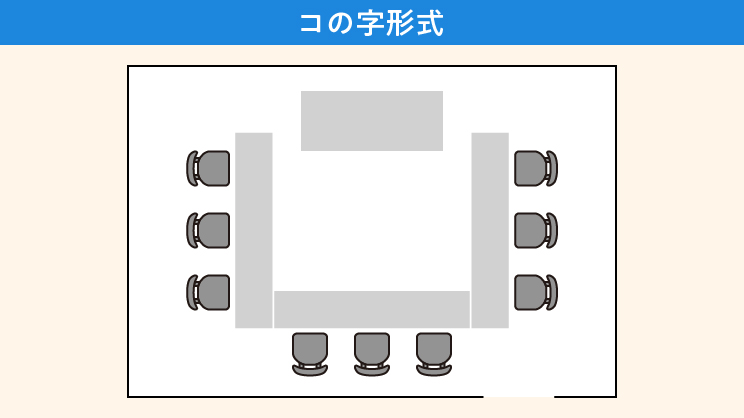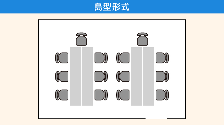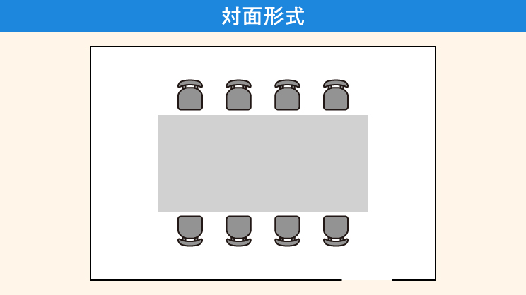 スクール形式、シアター形式と同じように、参加者全員が同じ方向を向くレイアウトですが、一人に一つの机と椅子を用意するのではなく、大きな机やソファを使用することで、会議室での参加者同士もコミュニケーションを取りやすく工夫することができます。