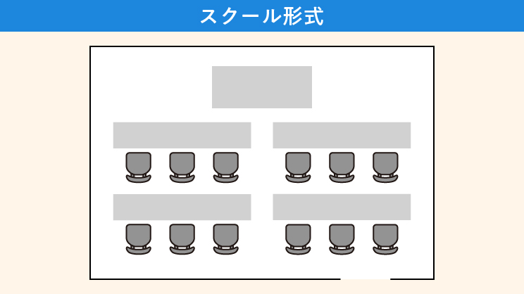 学校の教室のように、発表者に注目しやすい形式なので、参加者は全員同じ方向を見て話を聞きやすく、メモを取りやすいという特徴があります。