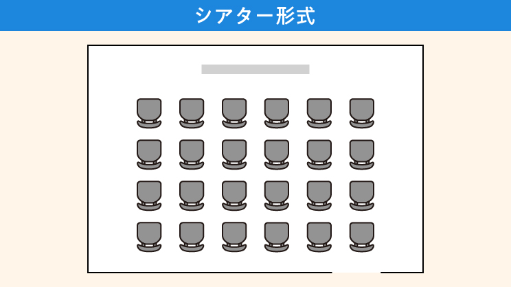 スクール形式と同じように、参加者全員が同じ方向を向きますが、机がないので、より多くの参加者を収容できます。スクリーンに向かって、座って観覧するスタイルです。