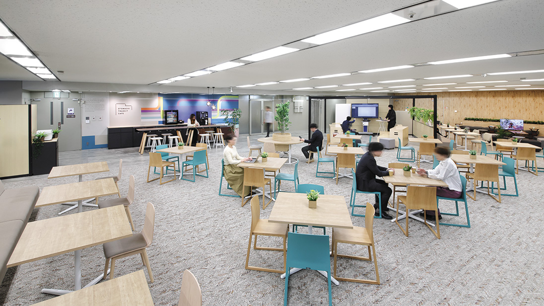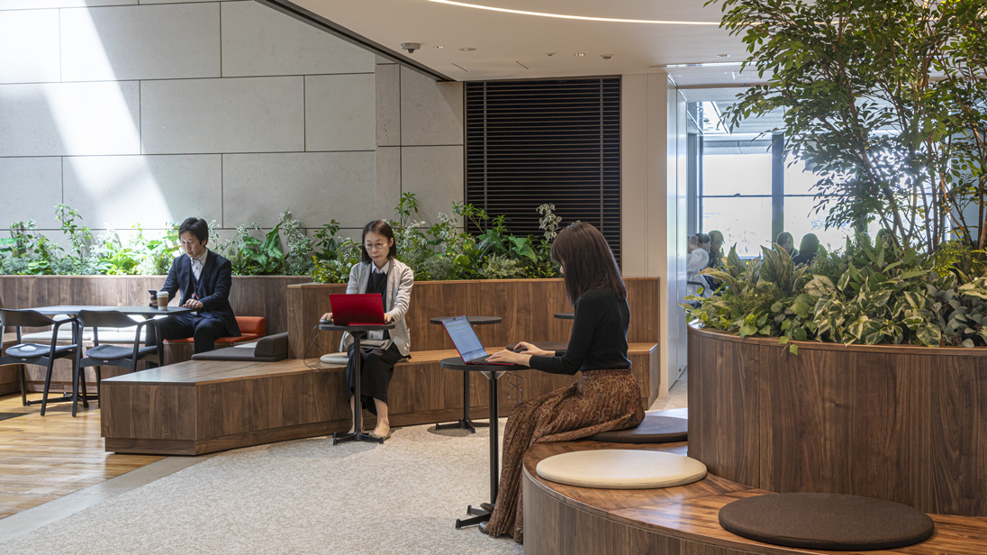 「人財ファースト企業への変革」を目指すKDDI株式会社は、大手町ビルを「新しい働き方の実践拠点」としてリニューアル。全社員が利用できるサテライトオフィスでは、デスク中央に配置したグリーンが視線をやわらげ、集中しやすい環境を実現しています。シンボリックなグラフィックウォール前に設けたカフェ「OTEMACHI TRANSIT CAFE」では、人が自然に集まり、会話や交流が生まれる空間づくりを行っています。