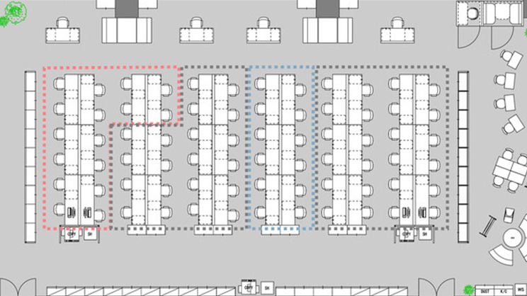 役職者も同じ列に座ることで、レイアウトの柔軟性も確保できます。島型での配置よりも、所要スペースを大きく削減できることが多いですね。