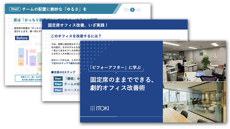 本記事の内容について、さらに「実際の図面を用いた解説」「具体的な見直しの仕方」「古いオフィスレイアウトから一新したビフォーアフター」などを詳しく掘り下げたダウンロード資料をご用意しています。ぜひダウンロードのうえ、「固定席オフィスだからこそできる」一歩先のオフィス改善にお役立てください!