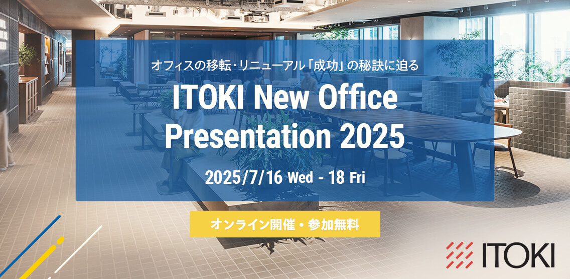 「ITOKI New Office Presentation 2025」では、イトーキがご支援したオフィスづくりの中から【移転】と【リニューアル】の事例をその後の効果までご紹介する2つの「オフィス事例紹介セミナー」に、数々の案件を担当してきた百戦錬磨のコンサルタントがオフィス移転のプロジェクト進行について1から解説する「ナレッジセミナー」を加えた、合わせて3つのオンラインセミナーをお届け!