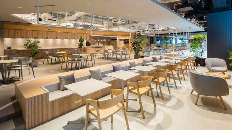 オフィスカフェを開放的なレイアウトにすることで、自然と人が集まりやすくなり、会話も弾みます。