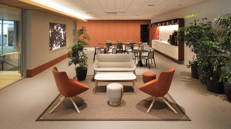 オフィスカフェのデザインは、執務エリアとはガラッと雰囲気が変わるように、開放的なリラックス感を醸し出すことがポイントです。