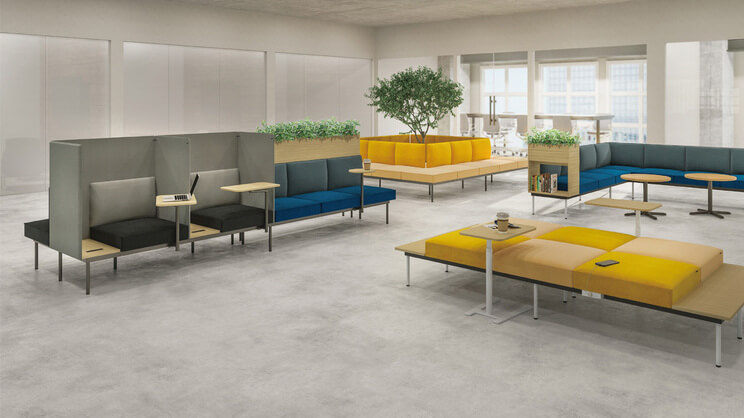 ソファの張地・色柄は、オフィスのデザインに合わせて5タイプから選べます。座下電源や座横天板など、働きやすさを考慮した様々な付属機能も人気です。