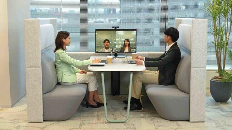 sound sofaは、Web会議に必要な機能がまるごと搭載された、ハイブリッドワーカーに最適なボックス型ソファです。