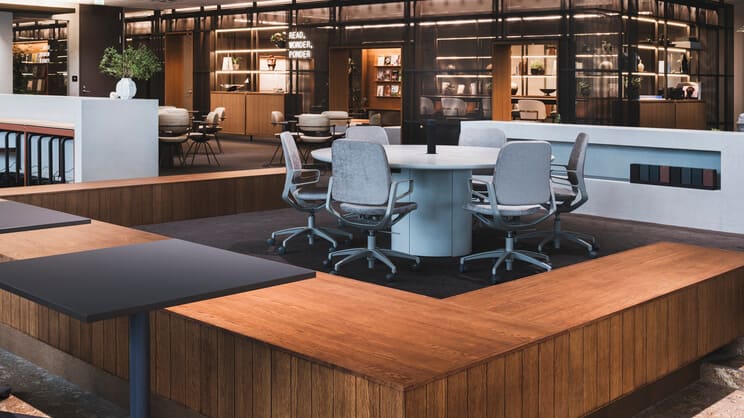 視線の高さに変化をつけることで空間に奥行きが生まれ、全体的な開放感も保てます。区切られた空間でありながら、チーム全体の一体感を感じられるのが特徴です。