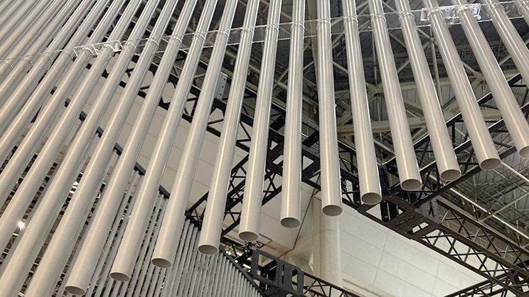 そのラインを形づくるのは、無数の塩化ビニールのパイプ。さまざまな長さのパイプを天井から吊り下げ、どこか有機的な曲線で空間デザインを仕上げました。この塩化ビニールのパイプは会期後リサイクルを行い、地球の未来にもしっかりと配慮しています。