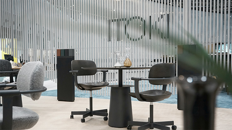 2025年予定のグローバルローンチに先駆け、このオルガテックで少しだけ先行公開した「J1890」。固有のブランドを示す名称ではなく、クリエイティブでエンジョイアブルな空間を作り出すための「プロジェクト」に冠された名前です。会場では「役員会議室」をイメージした円形のレイアウトを展示し、同じイトーキブース内の別エリアと映像をつなぎ次世代のエクゼクティブルームを演出。そのデザインは「痺れるほどカッコいい」と、多くのお客様の関心をいただきました。
