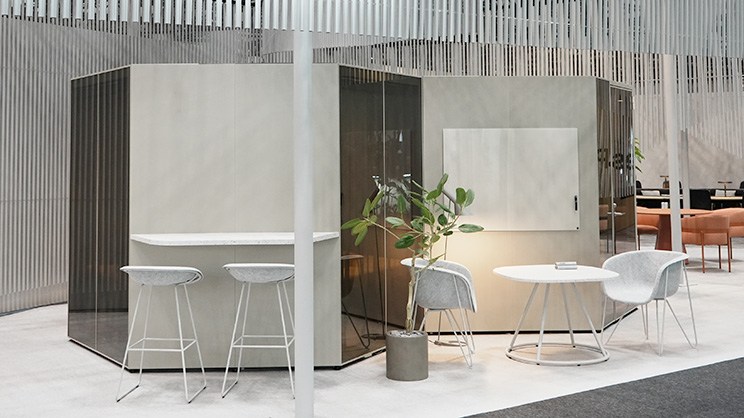 Hexa」。このカタチの最大の長所は、複数台を隣接して設置した際にその「余白」のスペースを有効に使えること。ブースの中だけではなく外にもミーティングスペースを併設でき、さらに幅広い活用シーンを生み出しています。また、向こう側が透けるような面の見せ方ができることで、閉塞感のないクリアな印象をもたらすのも魅力です。