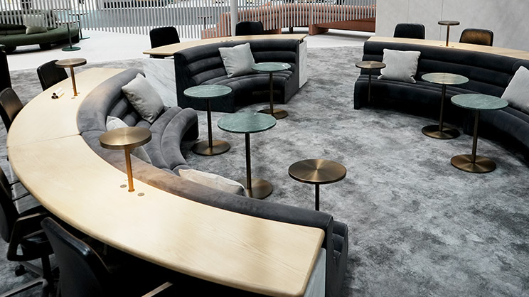 スペイン発の「esPattio」は、スペインの中庭(パティオ)のように人々が集まる明るい空間を織りなす家具ブランド。その名の通り、まるくやわらかな印象のラインでミーティングスペースもあたたかな雰囲気に仕上げます。同じ職場で働く仲間との対話が、ゆったりと和やかな時間に溶けていく…そんなイメージが浮かんできませんか?