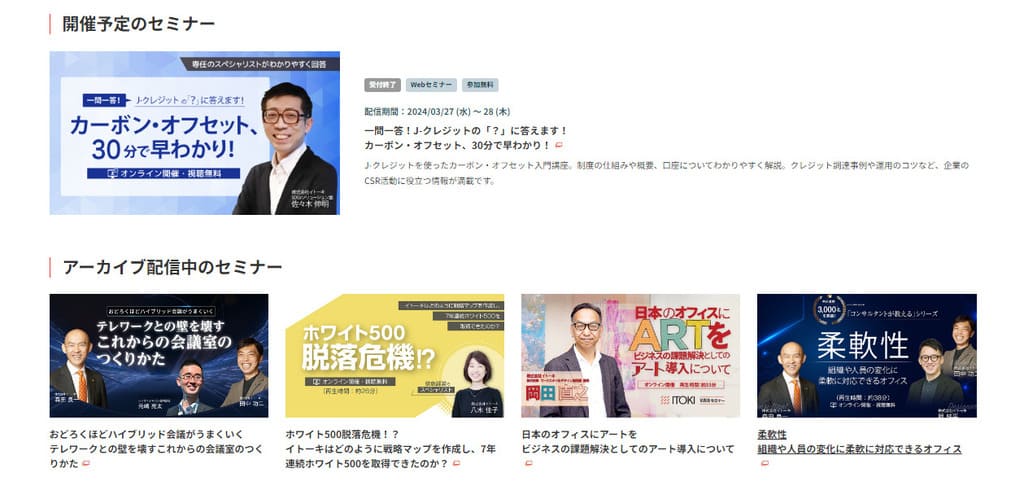いつもたくさんのお客様にご参加いただいているセミナーも、「セミナー情報」ページにまとめて掲載。開催予定のものだけでなく、アーカイブ配信中のものも豊富に掲載しています。