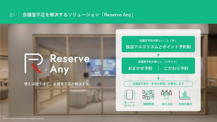 「Reserve Any(リザーブエニー)」は、使えば使うほど会議室不足が解決する、まったく新しい会議室予約システムです。