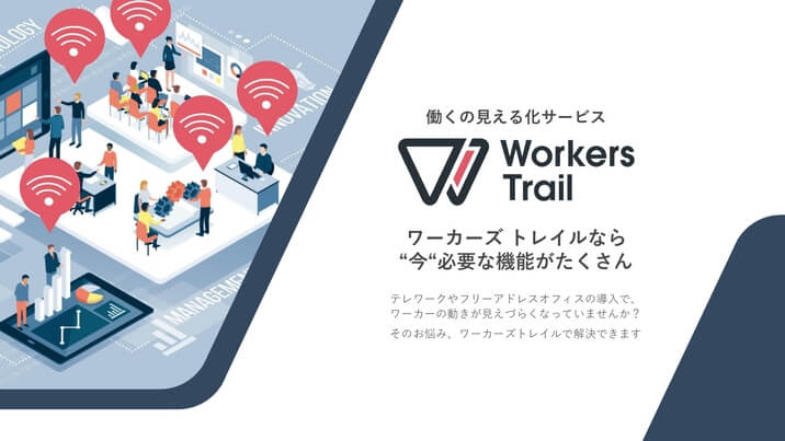 「Workers Trail(ワーカーズトレイル)」は、ワーカーの活動を見える化するソリューションです。フリーアドレスなど新しい働き方における課題を解決し、在席管理やリモートワーク支援、座席予約(ホテリング)機能を提供しています。