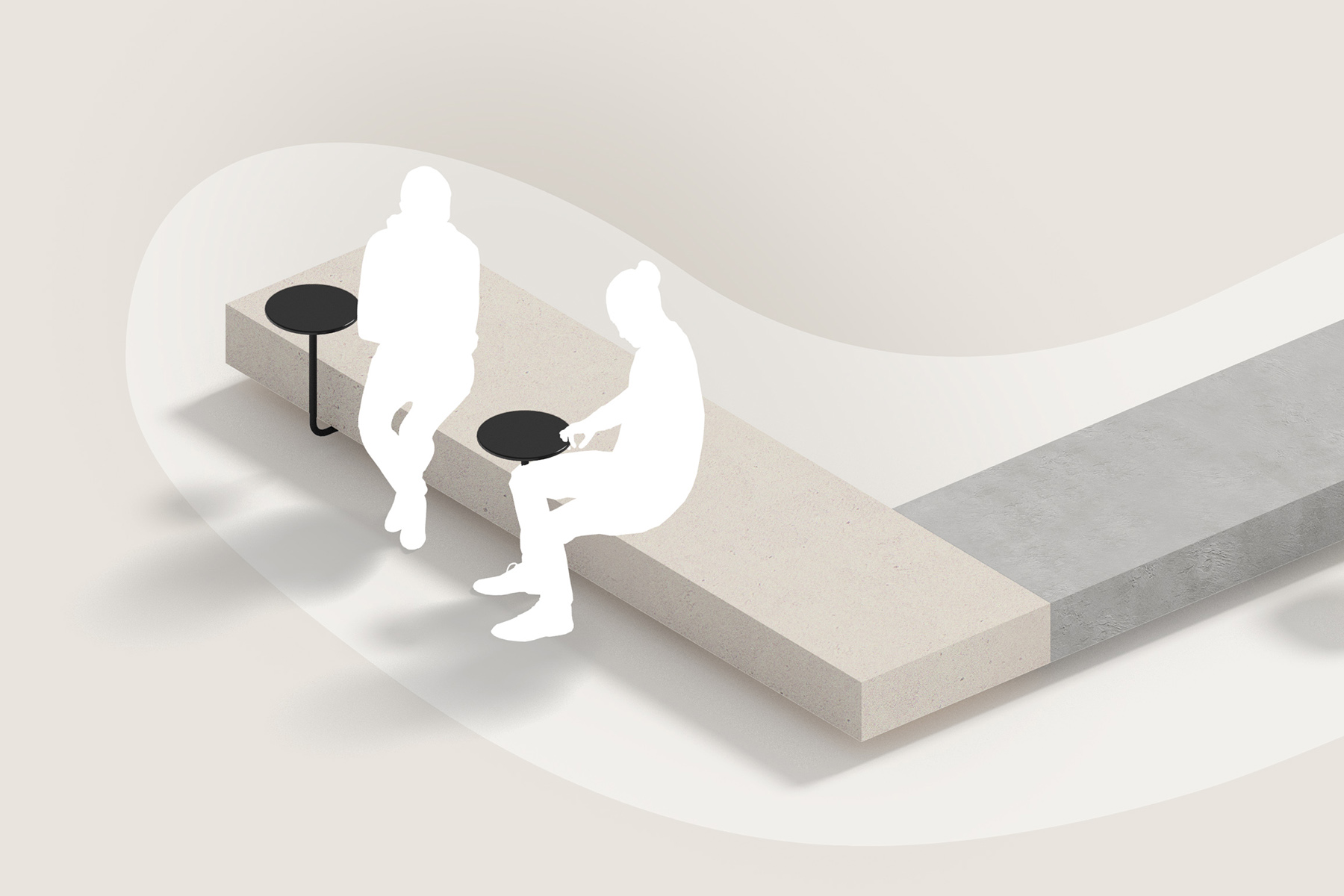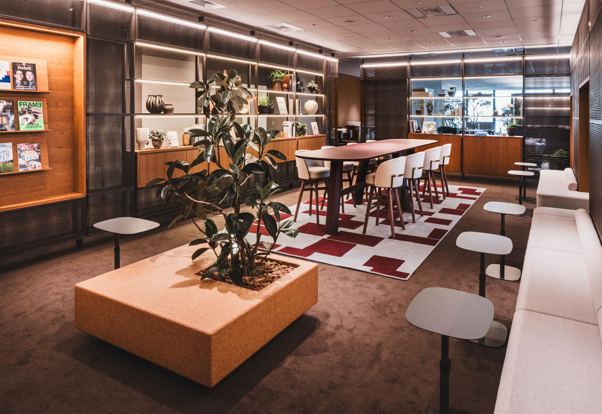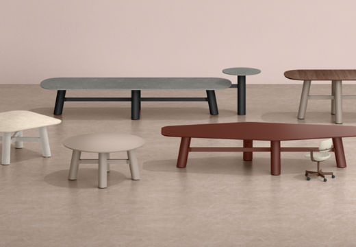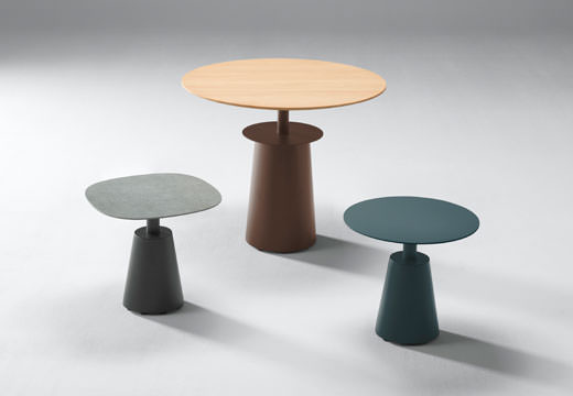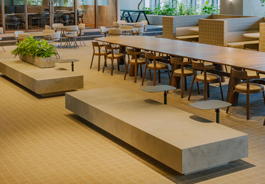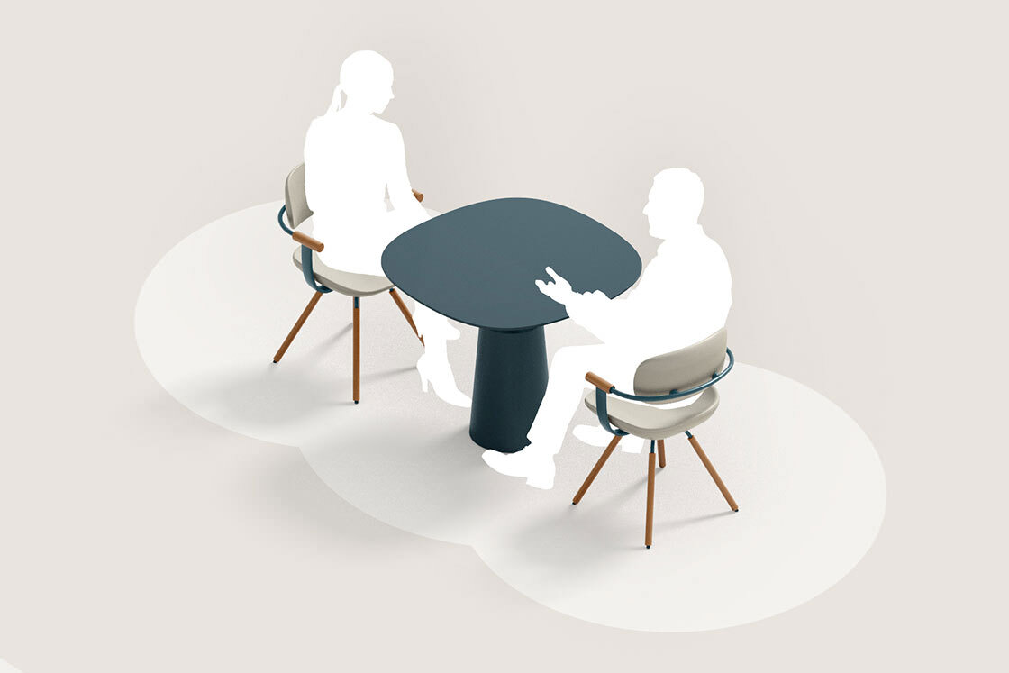 止まり木のようにコミュニケーションを生むテーブル「コノス」。例えばカフェテリアで少人数のミーティングをした後にそのまま個人作業を続けるなど、柔軟に使えます。働く気持ちを高めるデザイン性も魅力です。