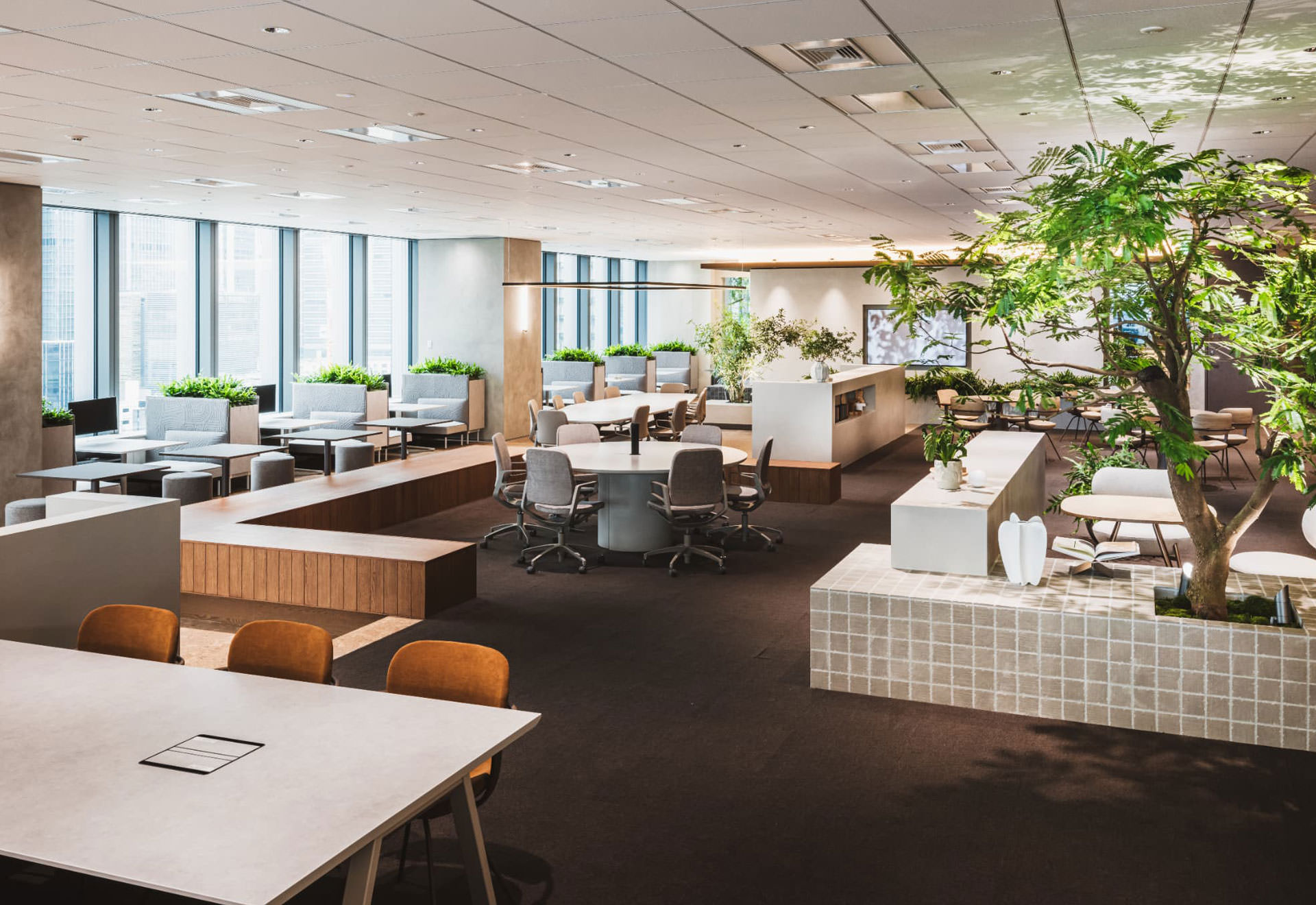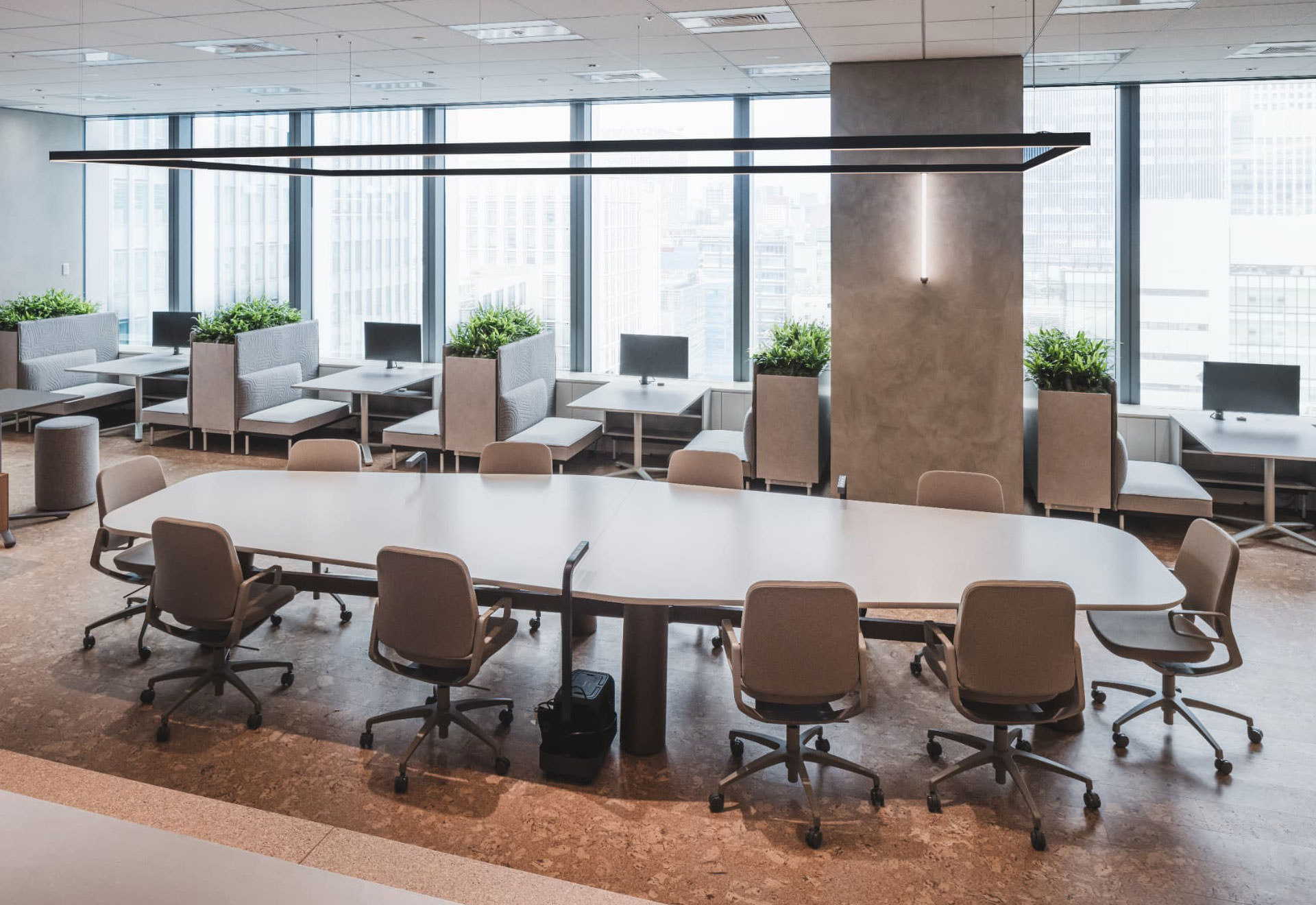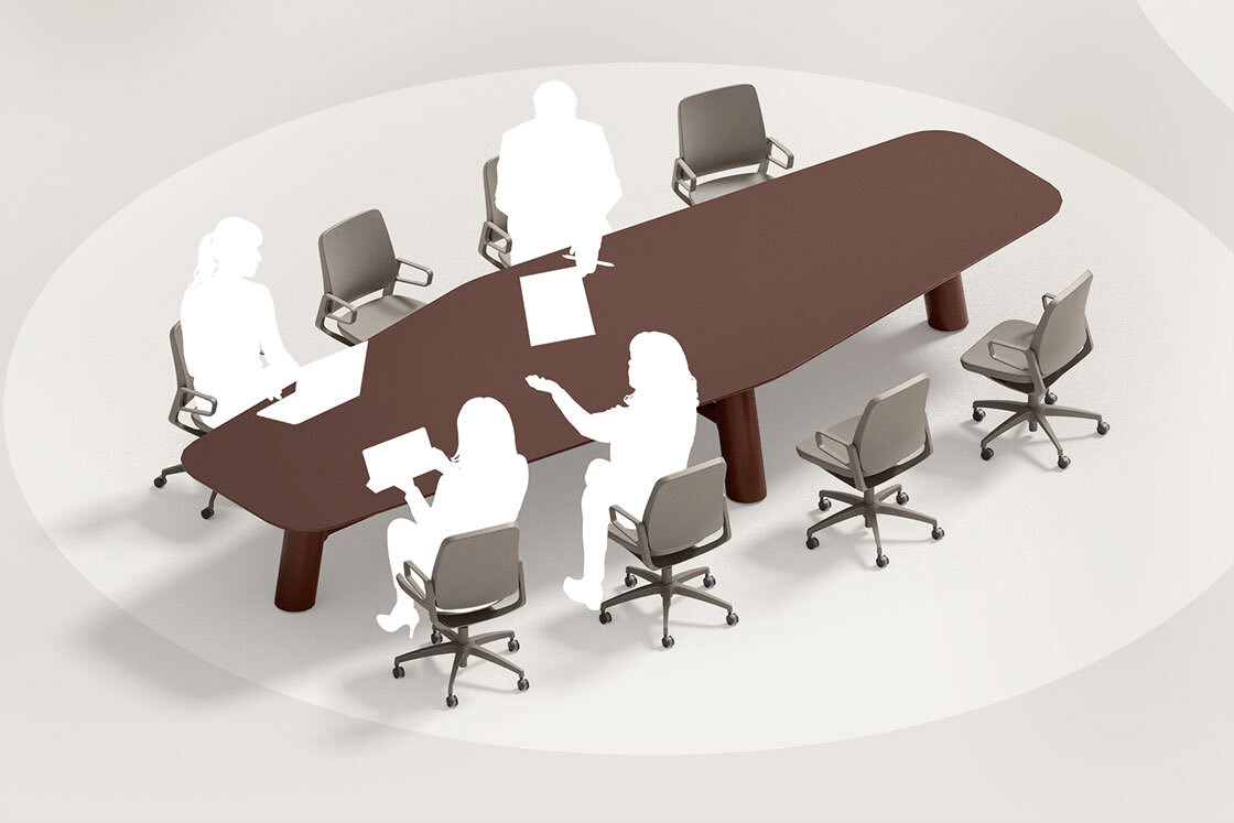 ビッグテーブルの「セントラ」は、人と人との多様なつながりを生み出す天板形状が特徴。チームで相談したいときは中央に集まったり、個人の作業に集中したいときは離れたり。距離感によってシームレスに用途を変えられる、いつでも快適に過ごせる居場所です。