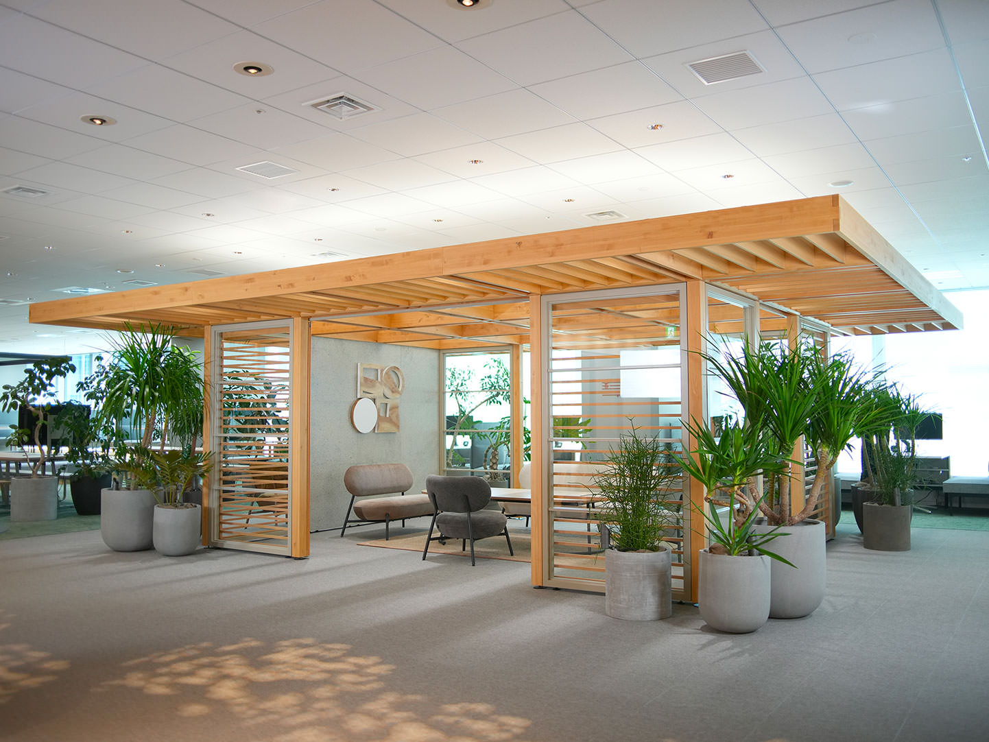 柱と梁で構成された木製フレームシステム「Pavilion Wood」は、屋内に東屋のような落ち着きある空間を生み出します。横ルーバーユニット越しに植栽を組み合わせることで、より穏やかで心地よい雰囲気が生まれ、休憩やカジュアルなミーティングスペースとしてオフィスに新たな役割をもたらします。