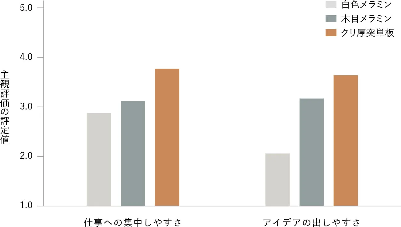 杉山:おおまかに言えば「クリ厚突単板の天板が良さそうだな」ということだと思います。ただ、クリ厚突単板と木目メラミンがほぼ同じで白色メラミンとは差があるという結果もあります。そう考えると目的に合わせた使い方があってしかるべきで、すべてを木にすれば良いわけではないと解釈しています。