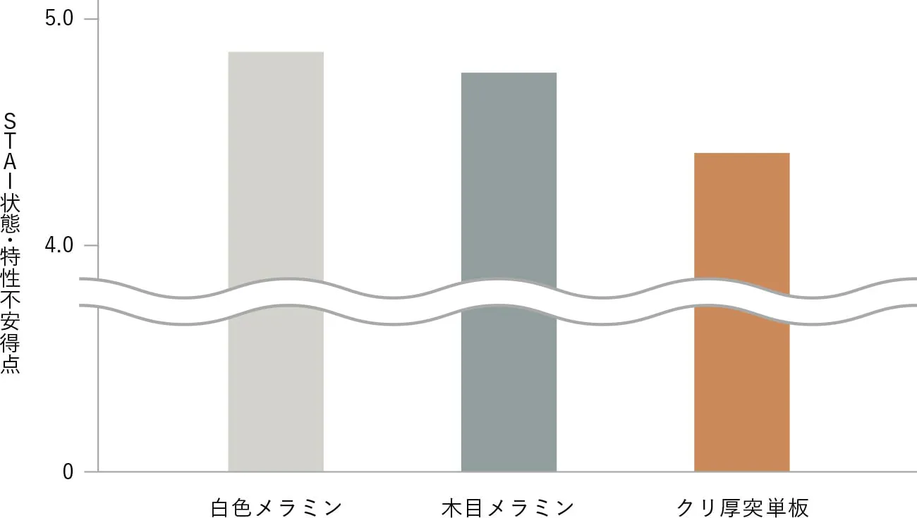 自覚症しらべは、疲労感、眠気感、不安定感、不快感、だるさ感、ぼやけ感に分けて評価します。結果としては不快感とだるさ感について白色メラミンに対してクリ厚突単板のほうが軽減している可能性が示されました。STAIは不安感を評価するもので、得点が高いほど不安ということになるのですが、測定の結果、白色メラミンに対してクリ厚突単板のほうが不安感が低い可能性が示されました[図2]。POMS2は気分状態を評価するもので、ここでも白色メラミンに対してクリ厚突単板のほうが疲労感や不安感を軽減させる可能性が示唆されました。