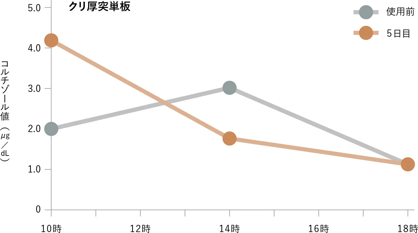 恒次:実際のオフィスで働きながらのデータで、ワーカーにはさまざまなストレスがかかります。ですから天板だけの影響とは言えませんが、コルチゾール濃度でこのような差が出たことは大きな成果です。その理由の1つとしてクリ厚突単板のテーブルが魅力的であったことがあると思います。