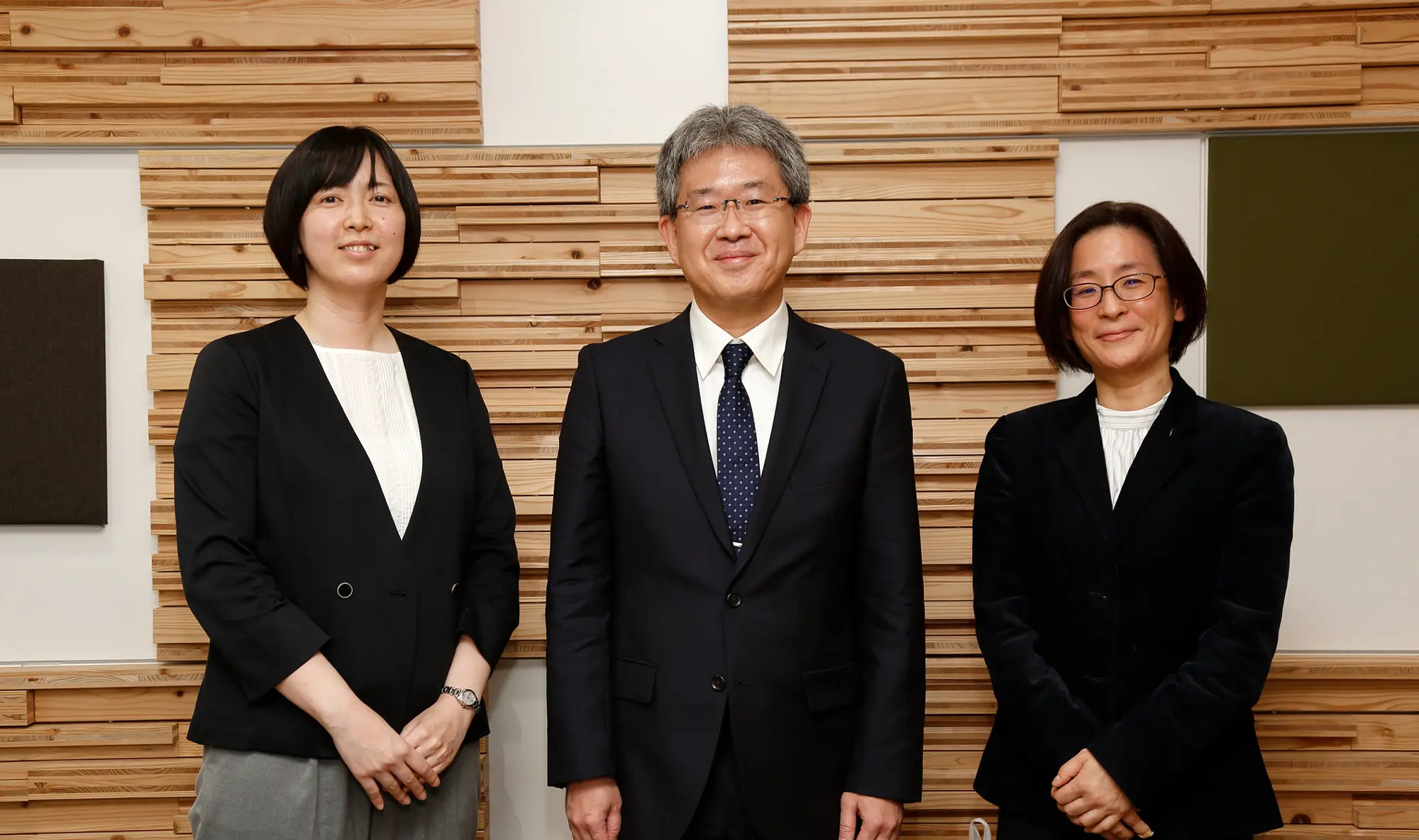 イトーキではその実証実験を行いました。共同研究を行った国立研究開発法人森林研究・整備機構森林総合研究所チーム長 杉山真樹氏(写真中央)、東京大学大学院農学生命科学研究科教授 恒次祐子氏(写真右)、聖徳大学心理・福祉学部心理学科准教授 白川真裕氏(写真左 ※撮影時は早稲田大学人間科学学術院)にお集まりいただき、実証実験の内容や結果、意義についてお聞きしました。