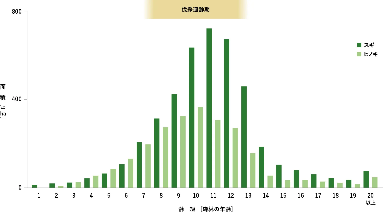 グラフ横軸の齢級は、林齢を5年の幅でくくった単位です。苗木を植栽した年を1年生として、1〜5年生を「1齢級」と数えます。出典:林野庁ホームページ