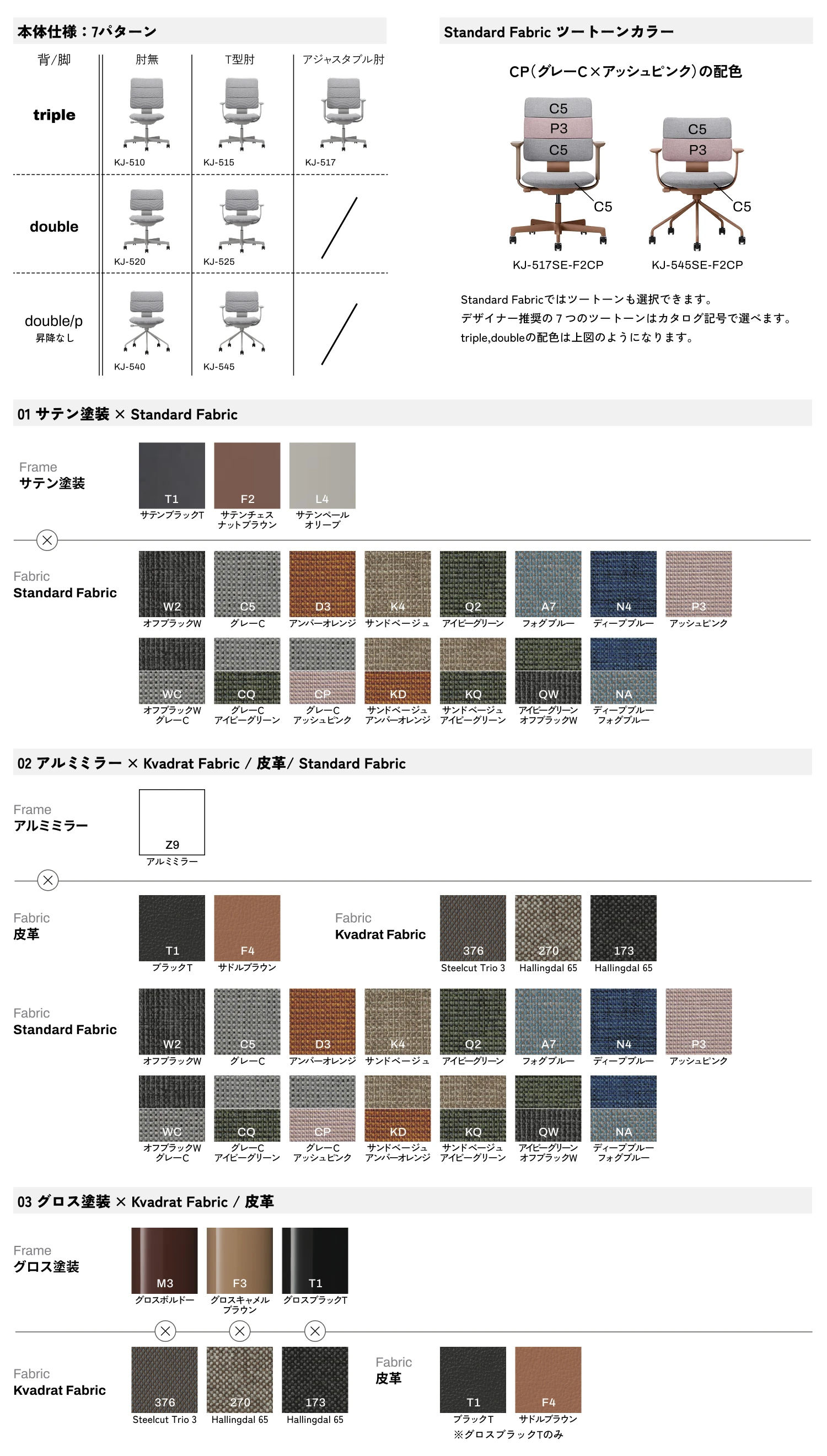 豊かなバリエーションもSHIGAの特徴のひとつです。オフィスのデザインに合わせて選べる7タイプの本体仕様に加え、張地は洗練された印象の単色(8色)や軽やかなツートーン(7色)から選べるオリジナルファブリック、北欧を代表するテキスタイルブランド〈Kvadrat〉社のファブリック(3色)、上質な雰囲気をもつ本革(2色)と、多彩なバリエーションをご用意しています。また、フレームの仕上げにはサテン塗装(3色)、アルミミラー、グロス塗装(3色)の3種類を採用。それぞれの素材が持つ質感、そして上質で落ち着いたカラーリングが、毎日座っても「心地よい」と思えるチェアを生み出すのです。