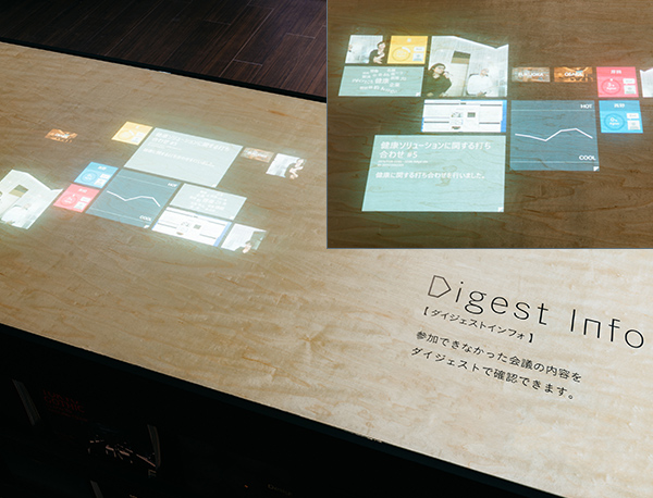 会議が盛り上がった瞬間を捉えたピクチャ、空気感をセンシングしたグラフデータ、会議で飛び交った単語を可視化したイメージなどから、場の雰囲気や参加者の同意度、討議内容を直感的に伝えます。会議の結論は、ひと目で内容を把握できるようサマリーとして簡潔に編集されています。
