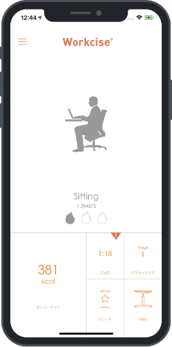 アプリで計測されるデータから、1日の消費カロリーが少ない/座位姿勢が連続した場合を検知します。不健康な状態が続くと「デスク天板が微昇降」し、立位姿勢への切り替えをアラートします。
